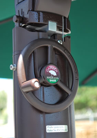 Optimal shade coverage is up to 72" tables or seating areas. The Easy Tilt Wheel enables the umbrella to be tilted at any angle in either direction by rotating the wheel. The easy Lift Controller allows the user to open and extend the main arm in one easy step by simply lifting the handle up. Galtech recommends sand or gravel (up to 100lbs) to achieve the desired weight for the base. The base is constructed out of a polyresin shell with metal reinforcement. Features: Easy Open Lift Easy Tilt Controller Tilts both left or right Solid Resin Hubs Double walled Aluminum ribs for additional strength Sand Filled Shell Base - holds 2 bags of sand ( 100 lbs) Residential applications (requires truck shipment)